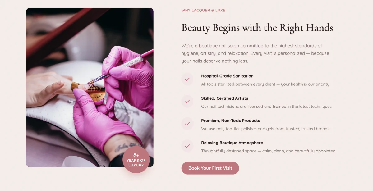The pattern ships four feature items: hospital-grade sanitation, certified nail artists, non-toxic products, and boutique atmosphere. Each item uses a rose checkmark badge and a two-line label/description pair. A “Book Your First Visit” pill button closes the section. The background uses the secondary palette color — a warm blush tone that sits comfortably between the hero and the services grid without adding visual noise.