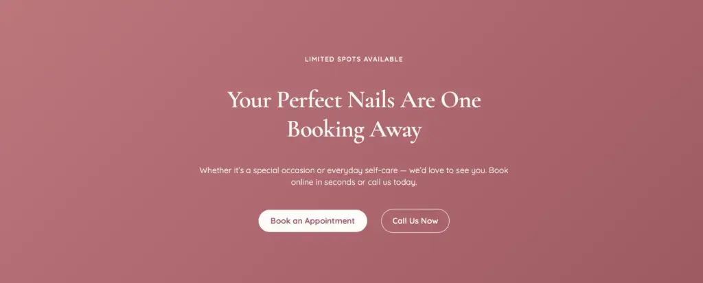 Most nail salon websites look the same: a pink header, a stock photo, and a booking button that goes nowhere. The template was designed for everyone, which means it works well for no one. A nail salon competes on atmosphere — the brand, the feel, the precision of the work. The website needs to reflect that before a client books their first appointment.