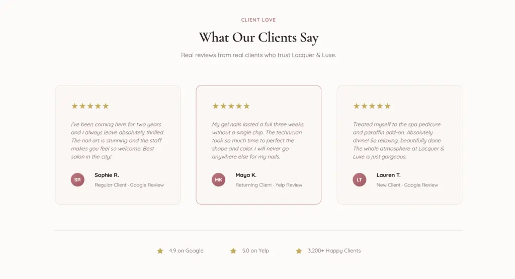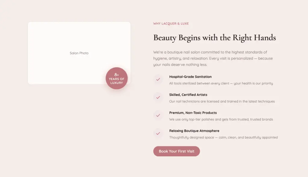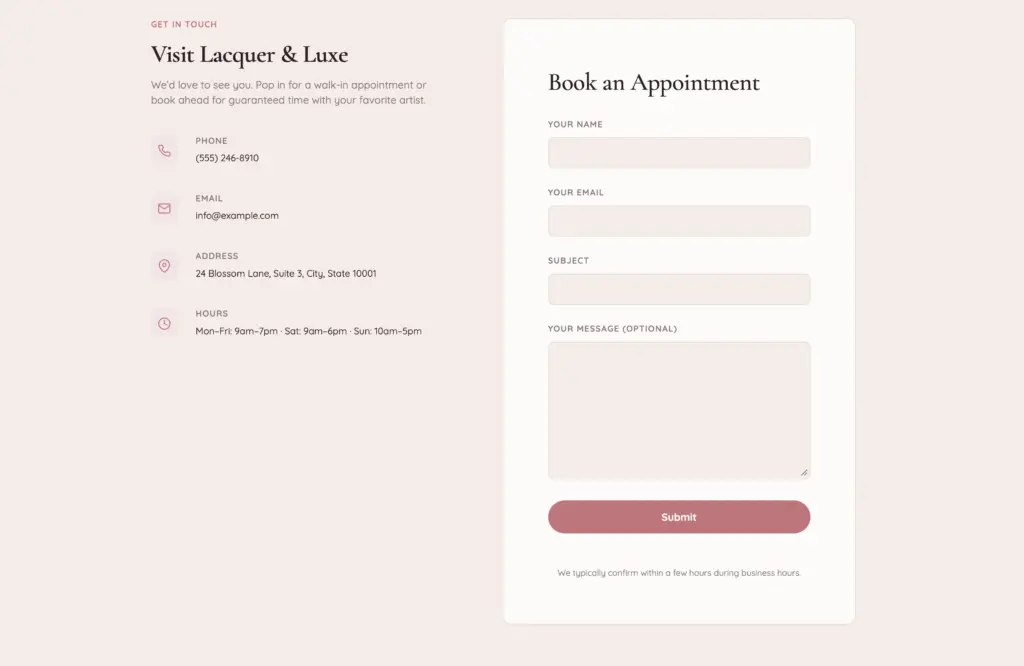 The demo salon is “Lacquer & Luxe,” a fictional brand created to show how the patterns work together at full fidelity. The hero photo is CC0. In production you’d replace it with real salon photography, swap the business name and contact details, and connect the booking form to your scheduling tool of choice.