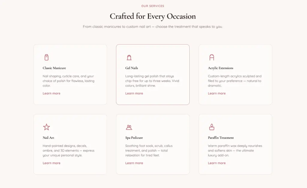 Services Grid — Six service cards in a responsive grid that adapts its column count automatically. Each card has a 40px SVG icon, a heading, a short description, and a price tag. The cards cover Classic Manicure, Gel Nails, Acrylic Extensions, Nail Art, Pedicure, and Paraffin Treatment.