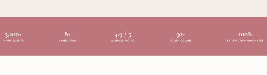 Stats Bar — Full-width rose background with five trust metrics: 3,200+ happy clients, 8+ years open, 4.9 Google rating, 500+ nail art designs, 100% satisfaction. Works as a visual break and a credibility signal between content sections.